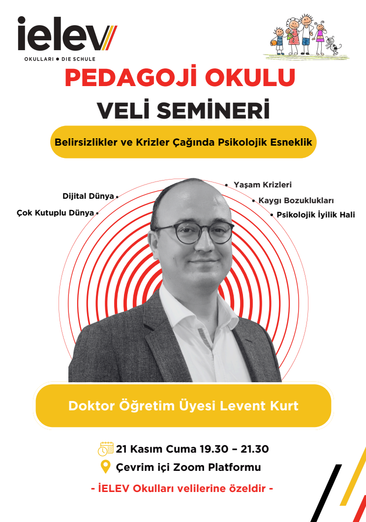 21 Kasım günü İstanbul Erkek Liseliler Eğitim Vakfı (İELEV) Okulları velileri ile Pedagoji Okulu etkinliğinde buluştum. Konumuz Belirsizlikler ve Krizler Çağında Psikolojik Esneklikti. Davetleri için değerli meslektaşım İELEV Psikolojik Danışma ve Rehberlik Bölümü koordinatörü Sn. Ayşen Akayoğlu ve ekibine teşekkür ederim.